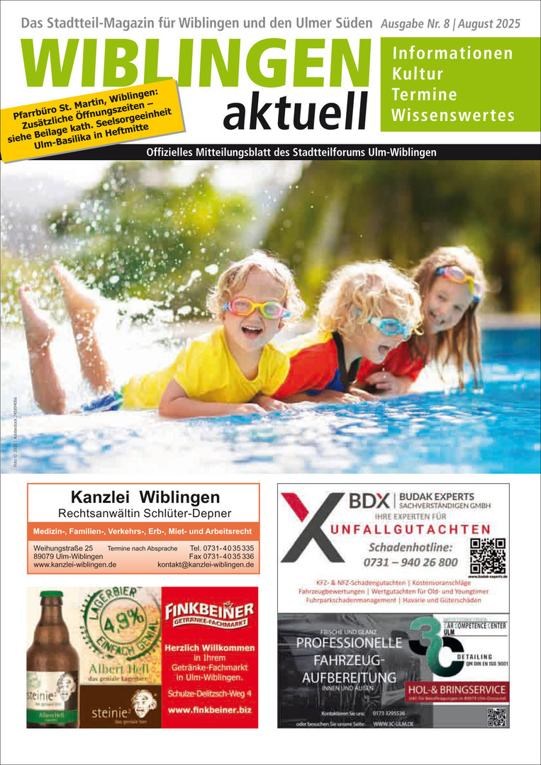 WIBLINGEN aktuell, das sich allein aus Werbeeinnahmen finanziert, hat einen hohen journalistischen Anspruch, will durch einen großen redaktionellen Anteil, verbunden mit sorgfältiger Recherche, Wiblingen eine Stimme geben, wichtige Informationen wie Termine und Adressen vermitteln und dabei das Auge erfreuen. Ein gelungenes Konzept, das aber nicht zuletzt nur funktionieren kann, wenn wir Wiblinger uns aktiv daran beteiligen, indem wir uns an der Gestaltung freuen, selbst auch einmal einen Artikel über unsere Aktivitäten verfassen und unsere Produkte und Dienstleistungen in Form von Inseraten publik machen.